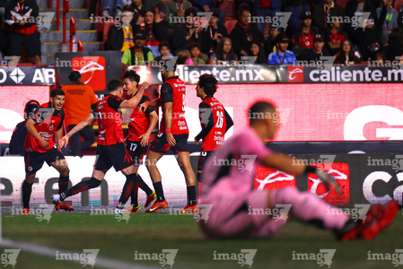 Tijuana, Baja California, 3 de abril de 2026. Jugadores de Xolos en festejo de gol, durante el partido correspondiente a la jornada 13 del torneo Clausura 2026 de la Liga BBVA MX, entre los Xolos de Tijuana y los Tigres de la UANL, realizado en el estadio Caliente. Foto: Imago7/ David Vega