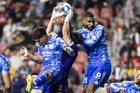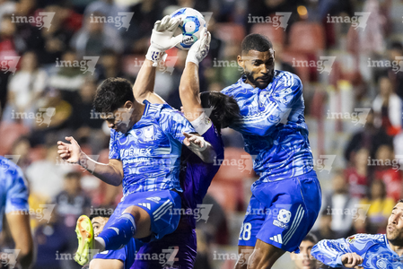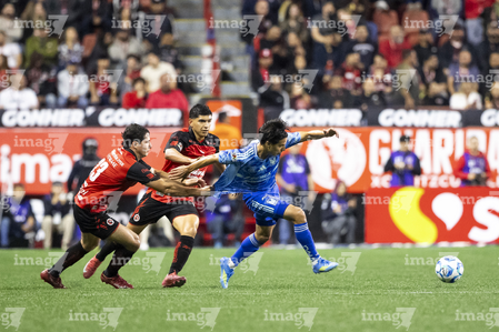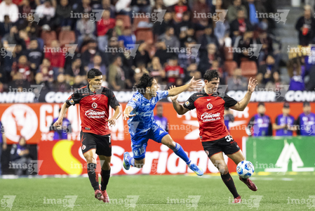 Tijuana, Baja California, 3 de abril de 2026. Marcelo Flores, José Ignacio Rivero y Ramiro Árciga, durante el partido correspondiente a la jornada 13 del torneo Clausura 2026 de la Liga BBVA MX, entre los Xolos de Tijuana y los Tigres de la UANL, realizado en el estadio Caliente. Foto: Imago7/Alejandro Gutiérrez Mora