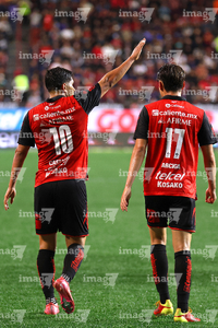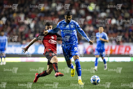 Tijuana, Baja California, 3 de abril de 2026. Rodrigo Aguirre y José Ignacio Rivero, durante el partido correspondiente a la jornada 13 del torneo Clausura 2026 de la Liga BBVA MX, entre los Xolos de Tijuana y los Tigres de la UANL, realizado en el estadio Caliente. Foto: Imago7/Alejandro Gutiérrez Mora