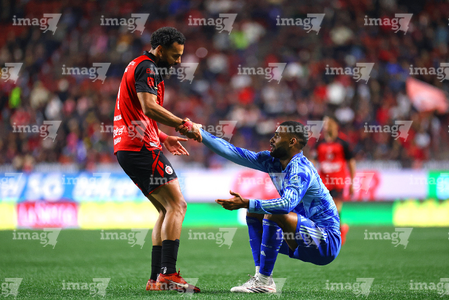 Tijuana, Baja California, 3 de abril de 2026. Ramiro Arciga y Fernando Gorriarán, durante el partido correspondiente a la jornada 13 del torneo Clausura 2026 de la Liga BBVA MX, entre los Xolos de Tijuana y los Tigres de la UANL, realizado en el estadio Caliente. Foto: Imago7/ David Vega