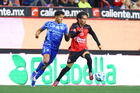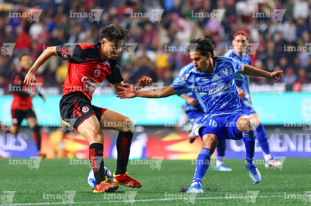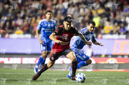 Tijuana, Baja California, 3 de abril de 2026. Jesús Alejandro Gómez y Ángel Correa, durante el partido correspondiente a la jornada 13 del torneo Clausura 2026 de la Liga BBVA MX, entre los Xolos de Tijuana y los Tigres de la UANL, realizado en el estadio Caliente. Foto: Imago7/Alejandro Gutiérrez Mora