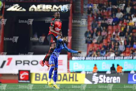 Tijuana, Baja California, 3 de abril de 2026. Jackson Porozo y Rodrigo Aguirre, durante el partido correspondiente a la jornada 13 del torneo Clausura 2026 de la Liga BBVA MX, entre los Xolos de Tijuana y los Tigres de la UANL, realizado en el estadio Caliente. Foto: Imago7/ David Vega