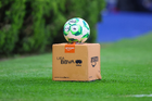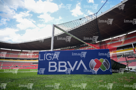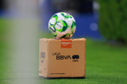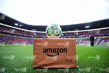 Guadalajara, Jalisco, 11 de abril de 2026. Balón de futbol Voit Aereus sobre caja de Amazon, durante el partido correspondiente a la jornada 14 del torneo Clausura 2026 de la Liga BBVA MX, entre los Rojinegros del Atlas y los Rayados del Monterrey, realizado en el estadio Jalisco. Foto: Imago7/ Hugo Ramirez