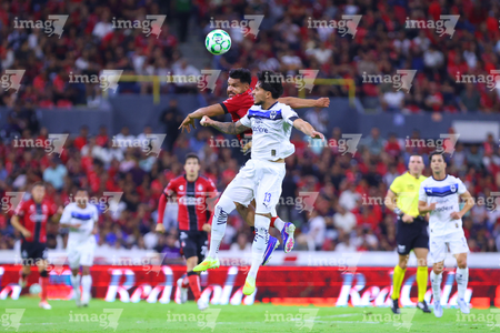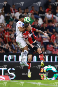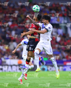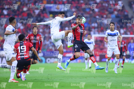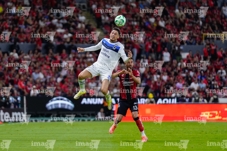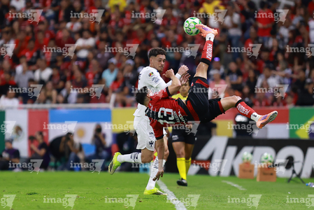 Guadalajara, Jalisco, 11 de abril de 2026. Víctor Guzmán y Eduardo Aguirre, durante el partido correspondiente a la jornada 14 del torneo Clausura 2026 de la Liga BBVA MX, entre los Rojinegros del Atlas y los Rayados del Monterrey, realizado en el estadio Jalisco. Foto: Imago7/ Alejandro Lias