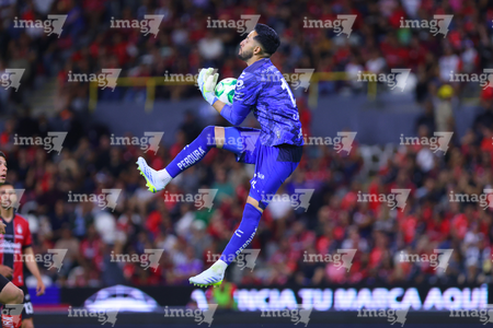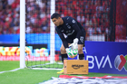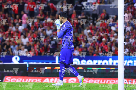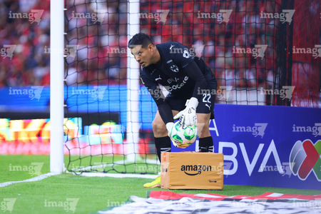 Guadalajara, Jalisco, 11 de abril de 2026. Luis Cárdenas toma Balón de futbol Voit Aereus de caja de Amazon, durante el partido correspondiente a la jornada 14 del torneo Clausura 2026 de la Liga BBVA MX, entre los Rojinegros del Atlas y los Rayados del Monterrey, realizado en el estadio Jalisco. Foto: Imago7/ Juan Carlos Cubeyro.