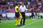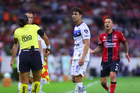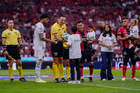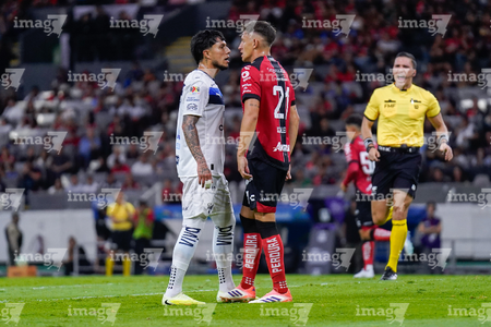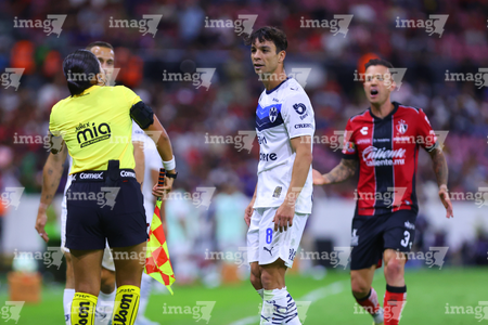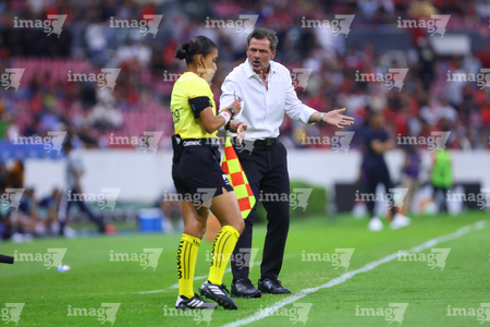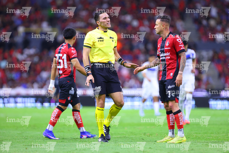 Guadalajara, Jalisco, 11 de abril de 2026. Yonatan Peinado Aguirre, árbitro central y Gustavo Ferrareis, durante el partido correspondiente a la jornada 14 del torneo Clausura 2026 de la Liga BBVA MX, entre los Rojinegros del Atlas y los Rayados del Monterrey, realizado en el estadio Jalisco. Foto: Imago7/ Juan Carlos Cubeyro.