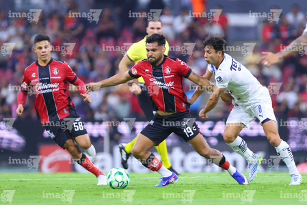 Guadalajara, Jalisco, 11 de abril de 2026. Lucas Ocampos, Eduardo Aguirre y Oliver Torres, durante el partido correspondiente a la jornada 14 del torneo Clausura 2026 de la Liga BBVA MX, entre los Rojinegros del Atlas y los Rayados del Monterrey, realizado en el estadio Jalisco. Foto: Imago7/ Juan Carlos Cubeyro.