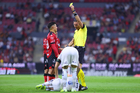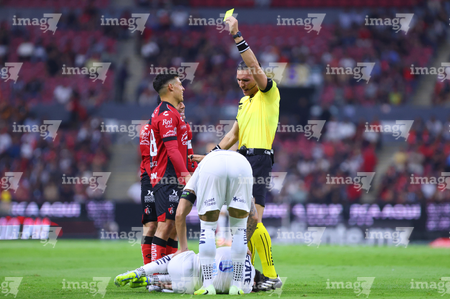 Guadalajara, Jalisco, 11 de abril de 2026. Yonatan Peinado, árbitro central muestra tarjeta amarilla de amonestación a Alfonso González, durante el partido correspondiente a la jornada 14 del torneo Clausura 2026 de la Liga BBVA MX, entre los Rojinegros del Atlas y los Rayados del Monterrey, realizado en el estadio Jalisco. Foto: Imago7/ Juan Carlos Cubeyro.