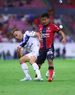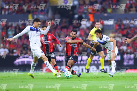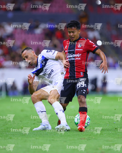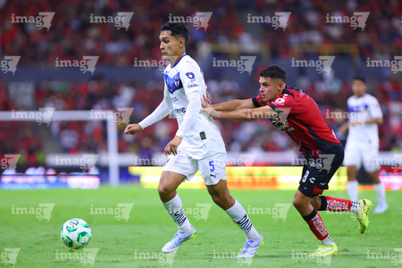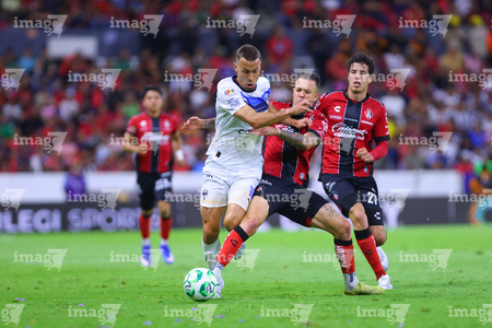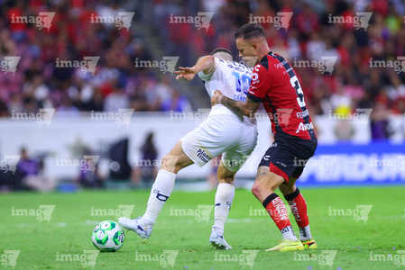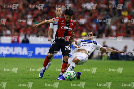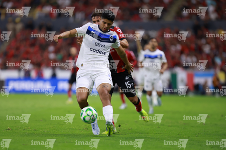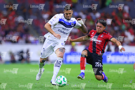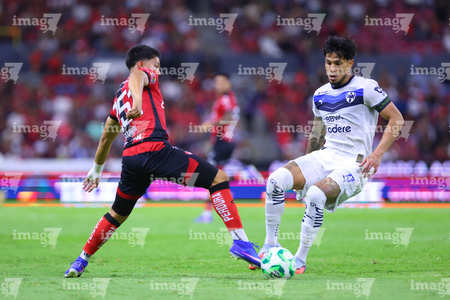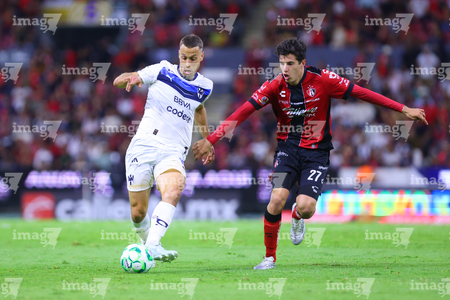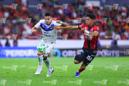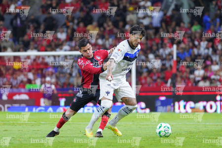 Guadalajara, Jalisco, 11 de abril de 2026. Lucas Ocampos y Gaddi Aguirre, durante el partido correspondiente a la jornada 14 del torneo Clausura 2026 de la Liga BBVA MX, entre los Rojinegros del Atlas y los Rayados del Monterrey, realizado en el estadio Jalisco. Foto: Imago7/ Alejandro Lias