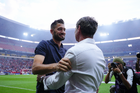 Guadalajara, Jalisco, 11 de abril de 2026. Nicolás Sánchez, director técnico interino y Diego Cocca, director técnico, durante el partido correspondiente a la jornada 14 del torneo Clausura 2026 de la Liga BBVA MX, entre los Rojinegros del Atlas y los Rayados del Monterrey, realizado en el estadio Jalisco. Foto: Imago7/ Hugo Ramirez