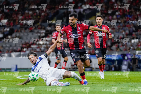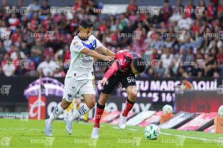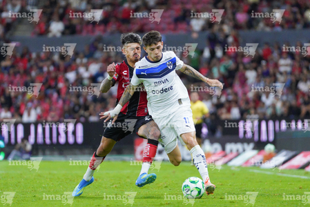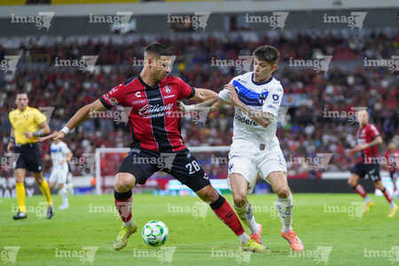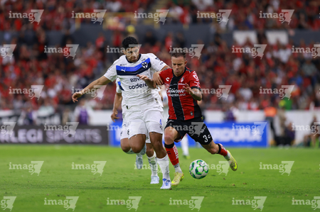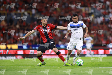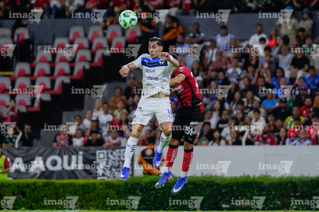 Guadalajara, Jalisco, 11 de abril de 2026. Víctor Guzmán y Eduardo Aguirre, durante el partido correspondiente a la jornada 14 del torneo Clausura 2026 de la Liga BBVA MX, entre los Rojinegros del Atlas y los Rayados del Monterrey, realizado en el estadio Jalisco. Foto: Imago7/ Juan Carlos Cubeyro.