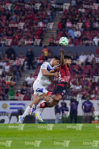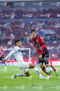 Guadalajara, Jalisco, 11 de abril de 2026. Ricardo Chávez y Paulo Ramirez, durante el partido correspondiente a la jornada 14 del torneo Clausura 2026 de la Liga BBVA MX, entre los Rojinegros del Atlas y los Rayados del Monterrey, realizado en el estadio Jalisco. Foto: Imago7/ Hugo Ramirez