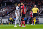 Guadalajara, Jalisco, 11 de abril de 2026. Carlos Salcedo y Rodrigo Schlegel en conato de bronca, durante el partido correspondiente a la jornada 14 del torneo Clausura 2026 de la Liga BBVA MX, entre los Rojinegros del Atlas y los Rayados del Monterrey, realizado en el estadio Jalisco. Foto: Imago7/ Alejandro Lias