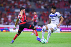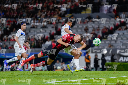 Guadalajara, Jalisco, 11 de abril de 2026. Víctor Guzmán y Gustavo Ferrareis, durante el partido correspondiente a la jornada 14 del torneo Clausura 2026 de la Liga BBVA MX, entre los Rojinegros del Atlas y los Rayados del Monterrey, realizado en el estadio Jalisco. Foto: Imago7/Cristian Hernandez