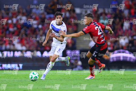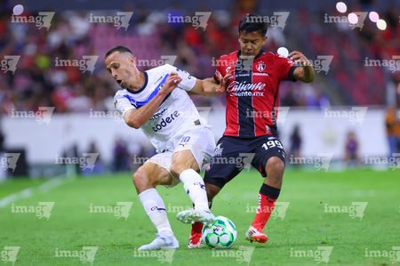 Guadalajara, Jalisco, 11 de abril de 2026. Gaddi Aguirre y Luca Orellano, durante el partido correspondiente a la jornada 14 del torneo Clausura 2026 de la Liga BBVA MX, entre los Rojinegros del Atlas y los Rayados del Monterrey, realizado en el estadio Jalisco. Foto: Imago7/ Hugo Ramirez
