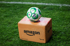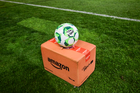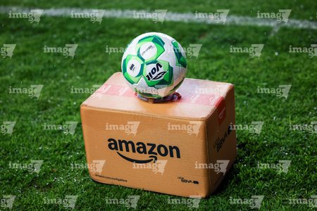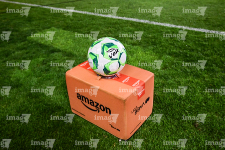 Pachuca, Hidalgo, 11 de abril de 2026. Balón de futbol Voit Aereus sobre caja de Amazon, durante el partido correspondiente a la jornada 14 del torneo Clausura 2026 de la Liga BBVA MX, entre los Tuzos del Pachuca y los Guerreros de Santos Laguna, realizado en el estadio Hidalgo. Foto: Imago7/ Elizabeth Hernández