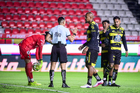 Pachuca, Hidalgo, 11 de abril de 2026. Ezequiel Bullaude y Brian García, durante el partido correspondiente a la jornada 14 del torneo Clausura 2026 de la Liga BBVA MX, entre los Tuzos del Pachuca y los Guerreros de Santos Laguna, realizado en el estadio Hidalgo. Foto: Imago7/ Alexis Chavez