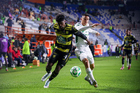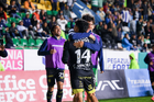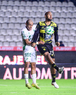 Pachuca, Hidalgo, 11 de abril de 2026. Robert Kenedy y Francisco Villalba, durante el partido correspondiente a la jornada 14 del torneo Clausura 2026 de la Liga BBVA MX, entre los Tuzos del Pachuca y los Guerreros de Santos Laguna, realizado en el estadio Hidalgo. Foto: Imago7/ Alexis Chavez