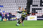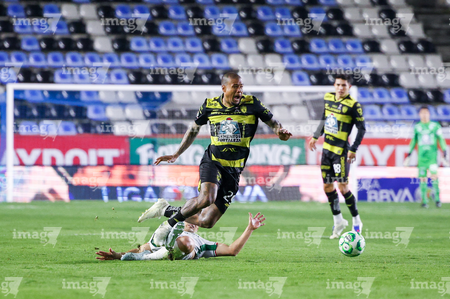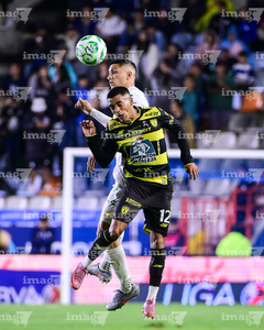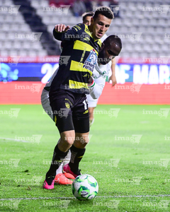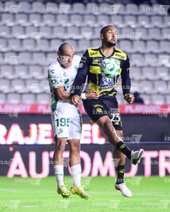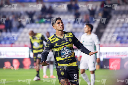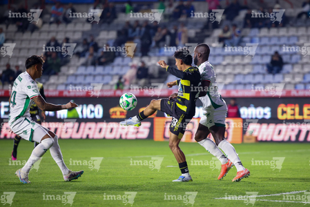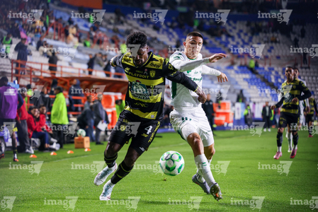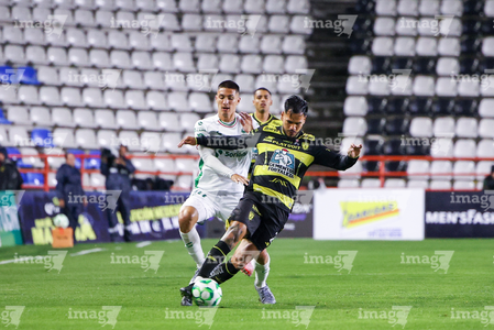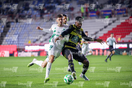 Pachuca, Hidalgo, 11 de abril de 2026. Ezequiel Bullaude y Sergio Barreto, durante el partido correspondiente a la jornada 14 del torneo Clausura 2026 de la Liga BBVA MX, entre los Tuzos del Pachuca y los Guerreros de Santos Laguna, realizado en el estadio Hidalgo. Foto: Imago7/ Elizabeth Hernández
