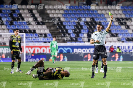 Pachuca, Hidalgo, 11 de abril de 2026. Martín Molina Astorga, árbitro central muestra tarjeta amarilla de amonestación, durante el partido correspondiente a la jornada 14 del torneo Clausura 2026 de la Liga BBVA MX, entre los Tuzos del Pachuca y los Guerreros de Santos Laguna, realizado en el estadio Hidalgo. Foto: Imago7/ Elizabeth Hernández