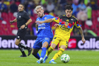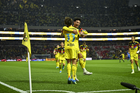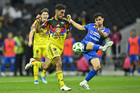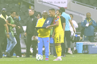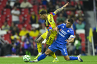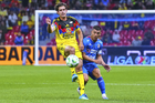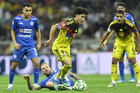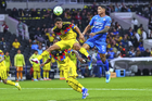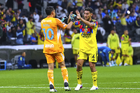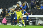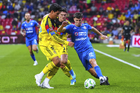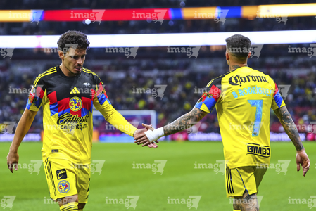 Ciudad de México, 11 de abril de 2026. Raphael Veiga y Brian Rodríguez, durante el partido correspondiente a la jornada 14 del torneo Clausura 2026 de la Liga BBVA MX, entre las Águilas del América y la Máquina Celeste del Cruz Azul, realizado en el estadio Banorte. Foto: Imago7/Carlos Vargas