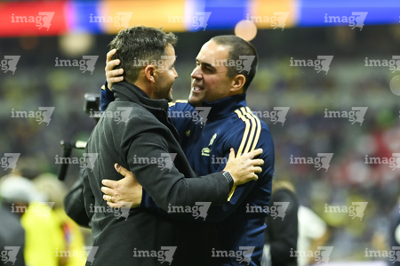 Ciudad de México, 11 de abril de 2026. Nicolás Larcamón, director técnico y Andre Jardine, director técnico, durante el partido correspondiente a la jornada 14 del torneo Clausura 2026 de la Liga BBVA MX, entre las Águilas del América y la Máquina Celeste del Cruz Azul, realizado en el estadio Banorte. Foto: Imago7/Etzel Espinosa
