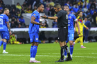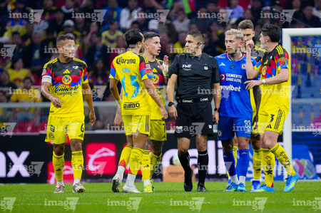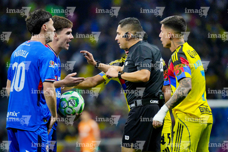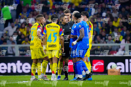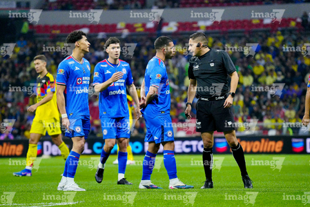 Ciudad de México, 11 de abril de 2026. José Paradela y Agustín Palavecino en reclamo a Óscar Mejía árbitro central, durante el partido correspondiente a la jornada 14 del torneo Clausura 2026 de la Liga BBVA MX, entre las Águilas del América y la Máquina Celeste del Cruz Azul, realizado en el estadio Banorte. Foto: Imago7 / Diego Padilla