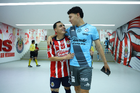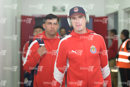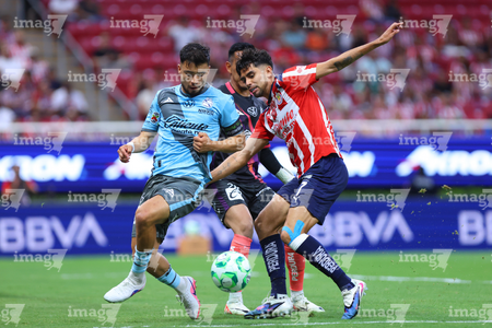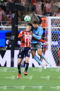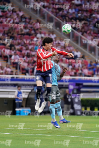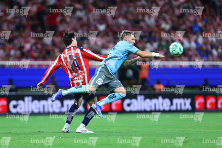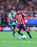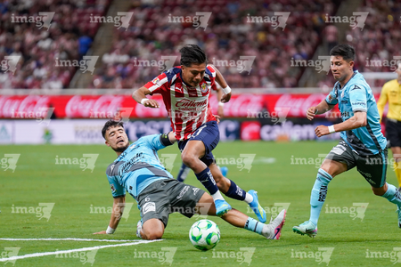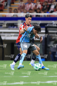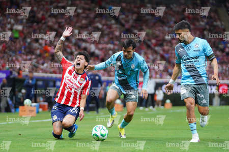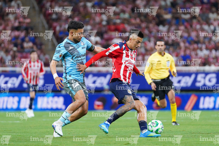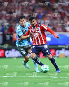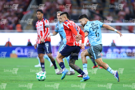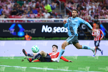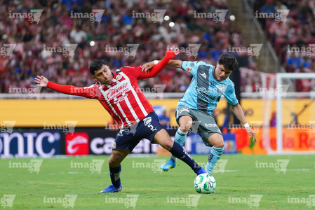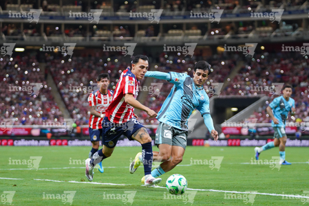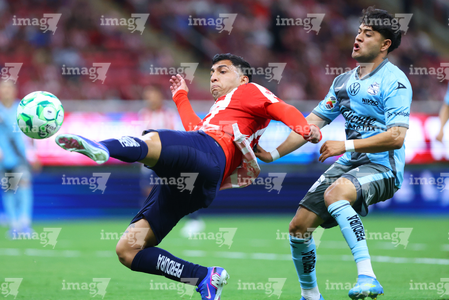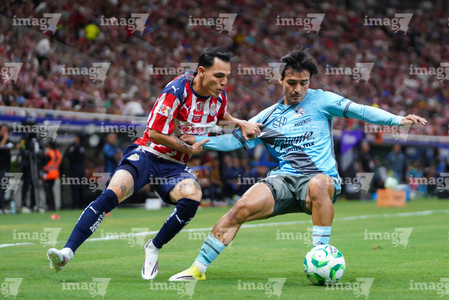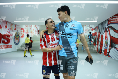 Zapopan, Jalisco, 18 de abril de 2026. Roberto Alvarado "Piojo" y Nicolás Díaz, durante el partido correspondiente a la jornada 15 del torneo Clausura 2026 de la Liga BBVA MX, entre las Chivas Rayadas del Guadalajara y el Club Puebla, realizado en el estadio Akron. Foto: Imago7/ Juan Carlos Cubeyro.