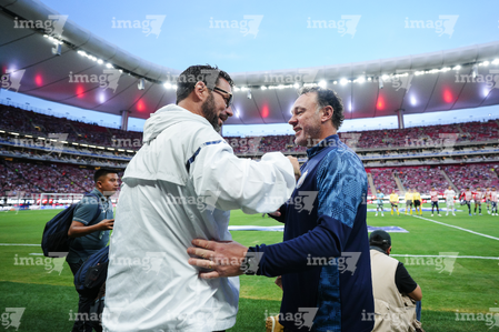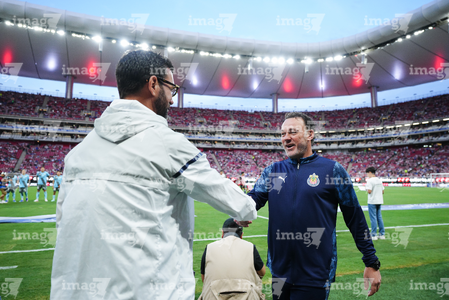Zapopan, Jalisco, 18 de abril de 2026. Albert Espigares, director técnico y Gabriel Milito, director técnico, durante el partido correspondiente a la jornada 15 del torneo Clausura 2026 de la Liga BBVA MX, entre las Chivas Rayadas del Guadalajara y el Club Puebla, realizado en el estadio Akron. Foto: Imago7/ Hugo Ramirez
