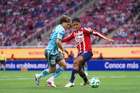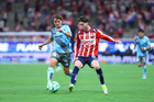 Zapopan, Jalisco, 18 de abril de 2026. Juan Vargas (D), durante el partido correspondiente a la jornada 15 del torneo Clausura 2026 de la Liga BBVA MX, entre las Chivas Rayadas del Guadalajara y el Club Puebla, realizado en el estadio Akron. Foto: Imago7/Cristian Hernandez