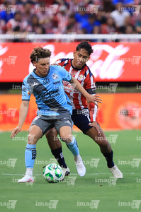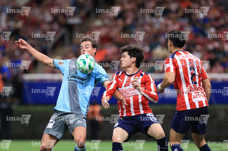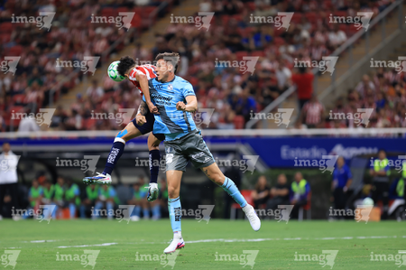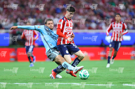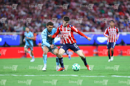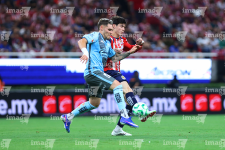 Zapopan, Jalisco, 18 de abril de 2026. Nicolás Díaz y Roberto Alvarado "Piojo", durante el partido correspondiente a la jornada 15 del torneo Clausura 2026 de la Liga BBVA MX, entre las Chivas Rayadas del Guadalajara y el Club Puebla, realizado en el estadio Akron. Foto: Imago7/ Hugo Ramirez