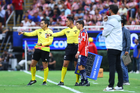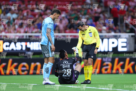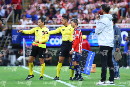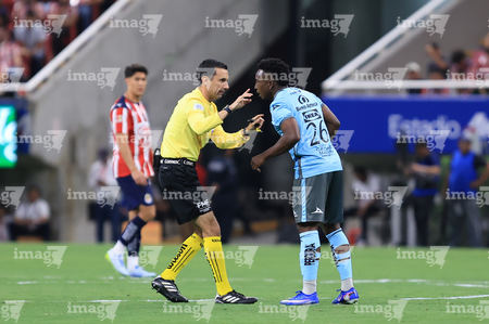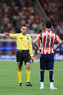 Zapopan, Jalisco, 18 de abril de 2026. César Arturo Ramos, árbitro central, y Kevin Velasco , durante el partido correspondiente a la jornada 15 del torneo Clausura 2026 de la Liga BBVA MX, entre las Chivas Rayadas del Guadalajara y el Club Puebla, realizado en el estadio Akron. Foto: Imago7/Cristian Hernandez