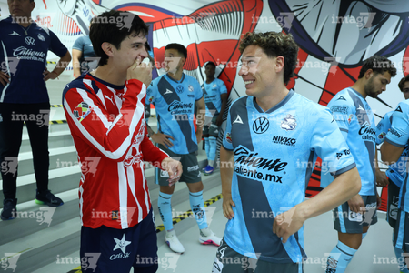Zapopan, Jalisco, 18 de abril de 2026. Brian Gutierrez y Alejandro Organista, durante el partido correspondiente a la jornada 15 del torneo Clausura 2026 de la Liga BBVA MX, entre las Chivas Rayadas del Guadalajara y el Club Puebla, realizado en el estadio Akron. Foto: Imago7/ Juan Carlos Cubeyro.