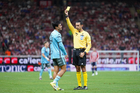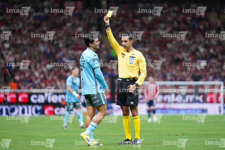 Zapopan, Jalisco, 18 de abril de 2026. César Arturo Ramos, árbitro central muestra tarjeta amarilla de amonestación a Fernando Monárrez, durante el partido correspondiente a la jornada 15 del torneo Clausura 2026 de la Liga BBVA MX, entre las Chivas Rayadas del Guadalajara y el Club Puebla, realizado en el estadio Akron. Foto: Imago7/ Hugo Ramirez