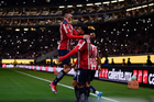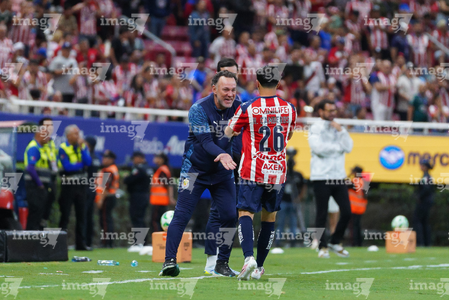 Zapopan, Jalisco, 18 de abril de 2026. Gabriel Milito, director técnico y Hugo Camberos en festejo de gol, durante el partido correspondiente a la jornada 15 del torneo Clausura 2026 de la Liga BBVA MX, entre las Chivas Rayadas del Guadalajara y el Club Puebla, realizado en el estadio Akron. Foto: Imago7/ Hugo Ramirez