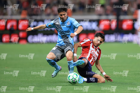 Zapopan, Jalisco, 18 de abril de 2026. Alejandro Organista y Luis Romo, durante el partido correspondiente a la jornada 15 del torneo Clausura 2026 de la Liga BBVA MX, entre las Chivas Rayadas del Guadalajara y el Club Puebla, realizado en el estadio Akron. Foto: Imago7/ Hugo Ramirez