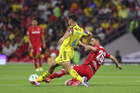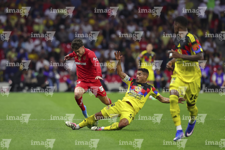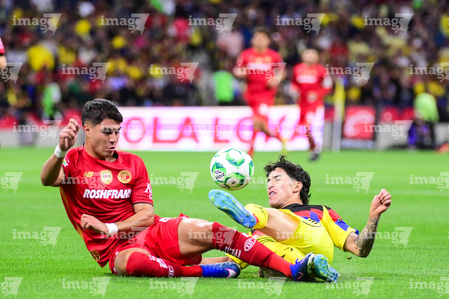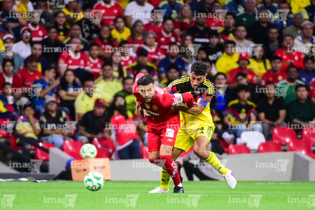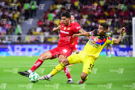 Ciudad de México, 18 de abril de 2026. Jesús Angulo "Canelo" y Franco Rossi, durante el partido correspondiente a la jornada 15 del torneo Clausura 2026 de la Liga BBVA MX, entre las Águilas del América y los Diablos Rojos del Toluca, realizado en el estadio Ciudad de los Deportes. Foto: Imago7/ Rafael Vadillo