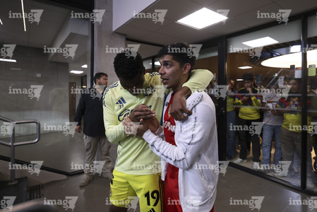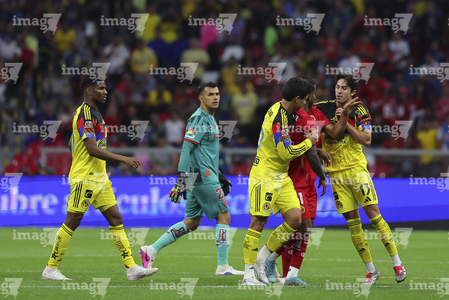 Ciudad de México, 18 de abril de 2026. Bruno Mendez y Sebastián Cáceres en conato de bronca, durante el partido correspondiente a la jornada 15 del torneo Clausura 2026 de la Liga BBVA MX, entre las Águilas del América y los Diablos Rojos del Toluca, realizado en el estadio Ciudad de los Deportes. Foto: Imago7/