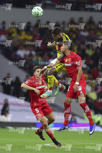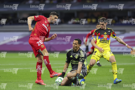 Ciudad de México, 18 de abril de 2026. Rodrigo Dourado, Nicolas Castro y Cristian Borja, durante el partido correspondiente a la jornada 15 del torneo Clausura 2026 de la Liga BBVA MX, entre las Águilas del América y los Diablos Rojos del Toluca, realizado en el estadio Ciudad de los Deportes. Foto: Imago7/ Alexis Chavez
