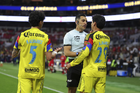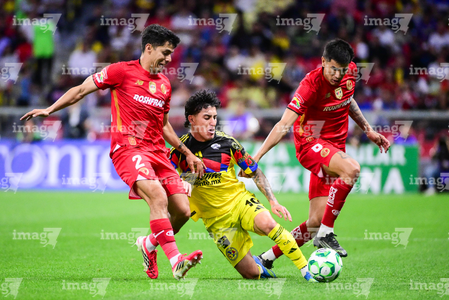 Ciudad de México, 18 de abril de 2026. Alexis Vega, Ismael Rosario López, árbitro central y Jonathan Dos Santos, durante el partido correspondiente a la jornada 15 del torneo Clausura 2026 de la Liga BBVA MX, entre las Águilas del América y los Diablos Rojos del Toluca, realizado en el estadio Ciudad de los Deportes. Foto: Imago7/ Rafael Vadillo
