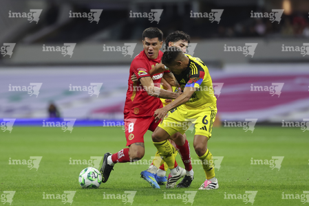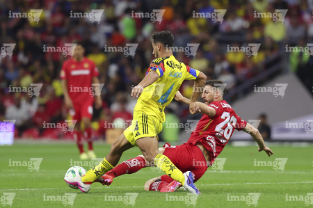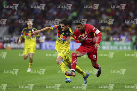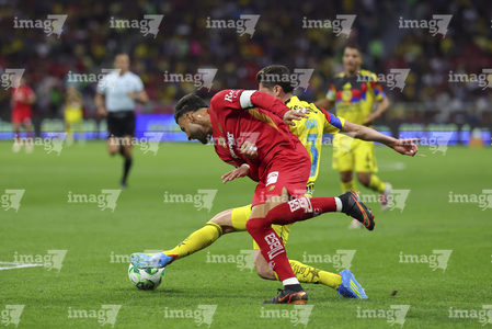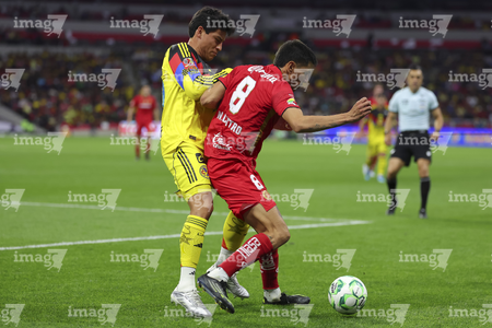 Ciudad de México, 18 de abril de 2026. Alexis Vega y Sebastián Cáceres, durante el partido correspondiente a la jornada 15 del torneo Clausura 2026 de la Liga BBVA MX, entre las Águilas del América y los Diablos Rojos del Toluca, realizado en el estadio Ciudad de los Deportes. Foto: Imago7/ Alexis Chavez