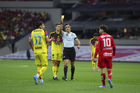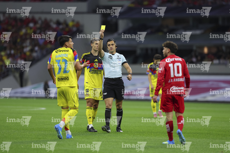Ciudad de México, 18 de abril de 2026. Ismael Rosario López, árbitro central muestra tarjeta amarilla de amonestación, durante el partido correspondiente a la jornada 15 del torneo Clausura 2026 de la Liga BBVA MX, entre las Águilas del América y los Diablos Rojos del Toluca, realizado en el estadio Ciudad de los Deportes. Foto: Imago7/ Rafael Vadillo