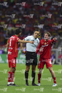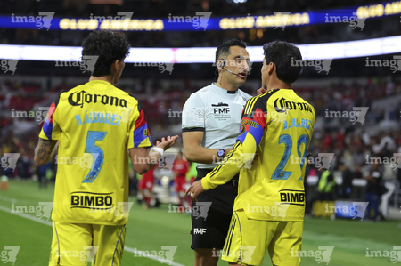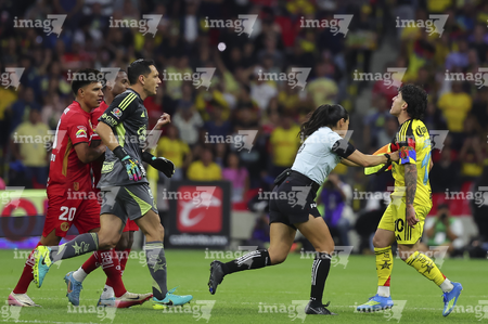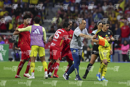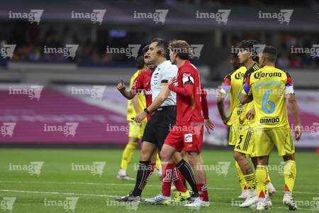 Ciudad de México, 18 de abril de 2026. Ismael Rosario López, árbitro central y Ramón Juárez, durante el partido correspondiente a la jornada 15 del torneo Clausura 2026 de la Liga BBVA MX, entre las Águilas del América y los Diablos Rojos del Toluca, realizado en el estadio Ciudad de los Deportes. Foto: Imago7/ Rafael Vadillo