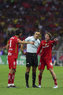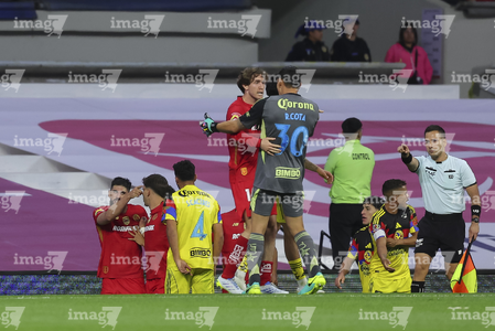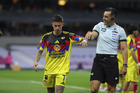 Ciudad de México, 18 de abril de 2026. Brian Rodríguez e Ismael Rosario López, árbitro central, durante el partido correspondiente a la jornada 15 del torneo Clausura 2026 de la Liga BBVA MX, entre las Águilas del América y los Diablos Rojos del Toluca, realizado en el estadio Ciudad de los Deportes. Foto: Imago7/ Rafael Vadillo