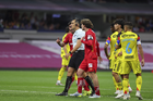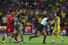 Ciudad de México, 18 de abril de 2026. Jonathan Dos Santos y Pavel Pérez en conato de bronca, durante el partido correspondiente a la jornada 15 del torneo Clausura 2026 de la Liga BBVA MX, entre las Águilas del América y los Diablos Rojos del Toluca, realizado en el estadio Ciudad de los Deportes. Foto: Imago7/ Rafael Vadillo