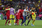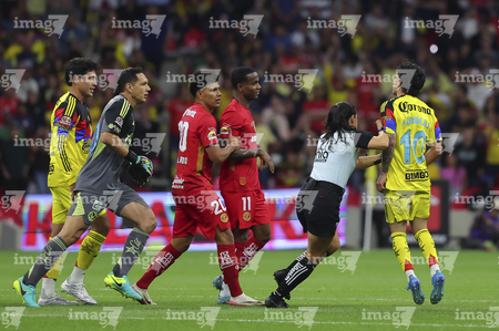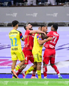 Ciudad de México, 18 de abril de 2026. Jugadores del Club América y Jugadores del Toluca en conato de bronca, durante el partido correspondiente a la jornada 15 del torneo Clausura 2026 de la Liga BBVA MX, entre las Águilas del América y los Diablos Rojos del Toluca, realizado en el estadio Ciudad de los Deportes. Foto: Imago7/