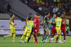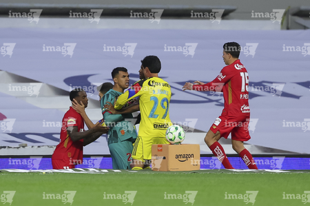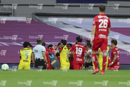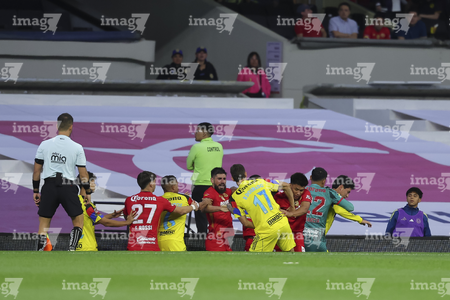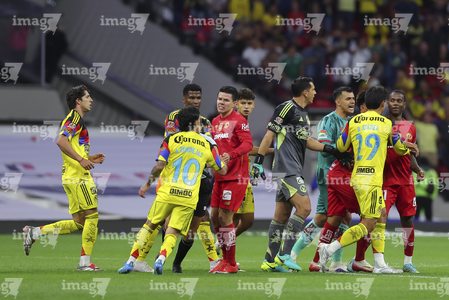 Ciudad de México, 18 de abril de 2026. Jugadores del Toluca y Jugadores del Club América en conato de bronca, durante el partido correspondiente a la jornada 15 del torneo Clausura 2026 de la Liga BBVA MX, entre las Águilas del América y los Diablos Rojos del Toluca, realizado en el estadio Ciudad de los Deportes. Foto: Imago7/