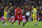 Ciudad de México, 18 de abril de 2026. Jugadores del Club América y Jugadores del Toluca en conato de bronca, durante el partido correspondiente a la jornada 15 del torneo Clausura 2026 de la Liga BBVA MX, entre las Águilas del América y los Diablos Rojos del Toluca, realizado en el estadio Ciudad de los Deportes. Foto: Imago7/ Alexis Chavez