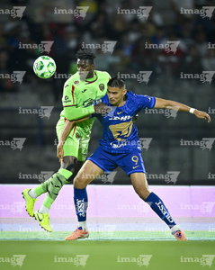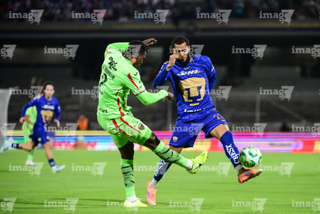 Ciudad de México, 21 de abril de 2026. Eder López y Robert Morales, durante el partido correspondiente a la jornada 16 del torneo Clausura 2026 de la Liga BBVA MX, entre los Pumas de la UNAM y los Bravos de FC Juárez, realizado en el estadio Olímpico Universitario. Foto: Imago7/ Manlio Contreras