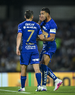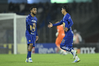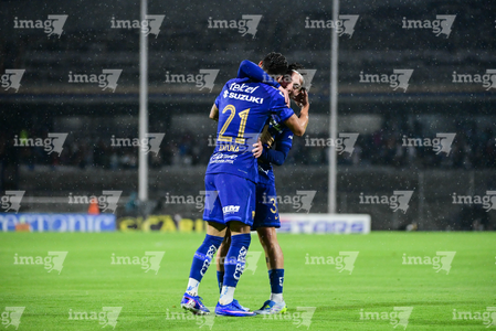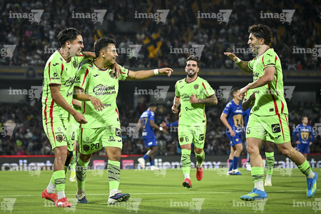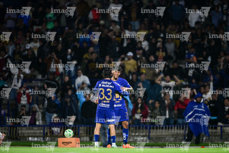 Ciudad de México, 21 de abril de 2026. Uriel Antuna y Jordan Carrillo en festejo de gol, durante el partido correspondiente a la jornada 16 del torneo Clausura 2026 de la Liga BBVA MX, entre los Pumas de la UNAM y los Bravos de FC Juárez, realizado en el estadio Olímpico Universitario. Foto: Imago7/ Alexis Chavez